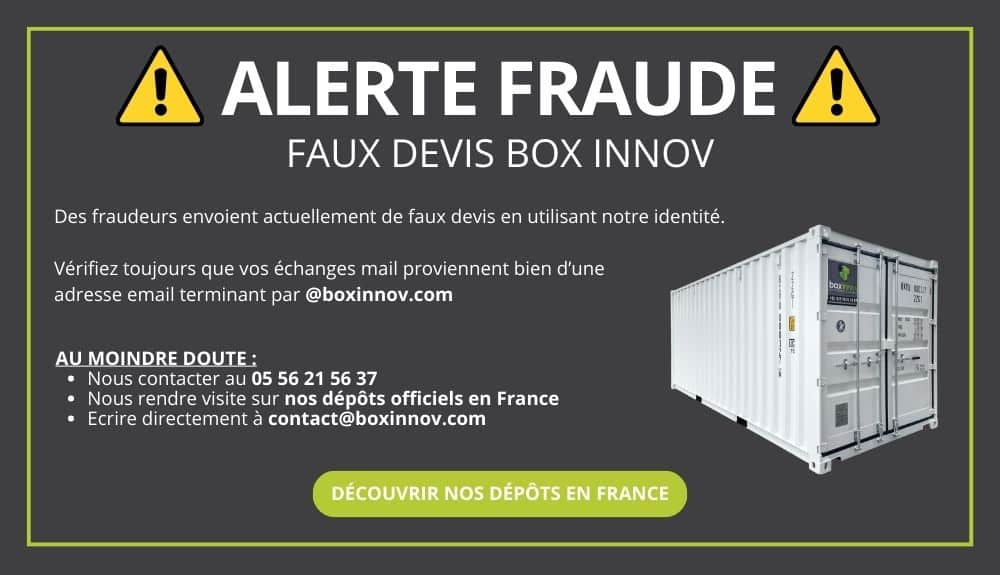 Nicolas Teisserenc10/07/2024Trustindex vérifie que la source originale de l'avis est Google. LIVRAISON RAPIDE Alexandre Berail04/07/2024Trustindex vérifie que la source originale de l'avis est Google. Bon renseignement, dans l'attente de livraison. Jean christophe Genin21/06/2024Trustindex vérifie que la source originale de l'avis est Google. Satisfait Alex Page18/06/2024Trustindex vérifie que la source originale de l'avis est Google. Je suis très satisfait de la société Box Innov. Les containers sont en excellent état et la livraison a été impeccable et rapide. Je recommande vivement leurs services. Clement Gleyze07/06/2024Trustindex vérifie que la source originale de l'avis est Google. Super, société prévenante sur la possibilité de bien déposer le container pour éviter des complications une fois sur place, on apprécie mieux vaut être transparents dès le début. Je recommande, container impeccable (20 ft 1er voyage) et société de transport ponctuelle et arrangeante dans la mesure du possible. Olivier Julien04/06/2024Trustindex vérifie que la source originale de l'avis est Google. Très bon accueil téléphonique avec toutes les explications , un devis en 10 mns et une proposition de rdv sur place pour voir le conteneur choisi pour le lendemain Arnaud Nicolas24/05/2024Trustindex vérifie que la source originale de l'avis est Google. Très bien pour notre tournoi de foot sur 3,5 jours, on a pu tout stocker dedans. Merci à Laura Huteau la commerciale pour les renseignements Cédric Nectoux15/05/2024Trustindex vérifie que la source originale de l'avis est Google. Bonjour, service client très réactif et compétent. Livraison sans soucis. État du conteneur conforme.